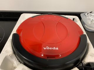 Robot aspirador Vileda de color rojo y negro. - Diseño redondo. - Panel de control con botones. -Es muy básico pero funciona muy bien,no friega,lo dejo claro,habría que comprar lo que son los recambios de tela, ya que solo tengo dos,lo vendo por qué ya no lo uso .