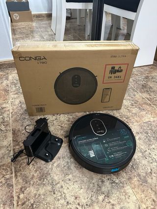 Aspiradora robot Conga 1790 en buen estado. Incluye dos cepillos laterales, dos mopas y base de carga. Funciona perfectamente. - Limpieza eficiente. - Aspira y friega. - Control mediante app. - Recarga automática.