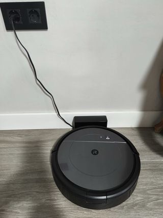 Robot aspirador Roomba en color gris oscuro. Diseñado para facilitar la limpieza del hogar. - Forma circular. - Base de carga incluida. -Aspira y friega -Recambio de mopas.
