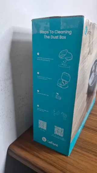 Robot aspirador Lefant para la limpieza del hogar. Incluye instrucciones para el mantenimiento de la caja de polvo. - Pasos para la limpieza de la caja de polvo. - Incluye QR para la app Lefant. - Incluye QR para video tutorial de instalación.