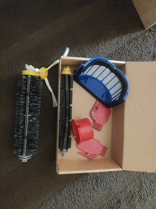 Repuestos rodillos limpieza, cepillo pequeño y filtro robot aspirador Roomba 650. Debe de servir parass modelos. Solo está ligeramente usado el cepillo grande, el resto, sin uso