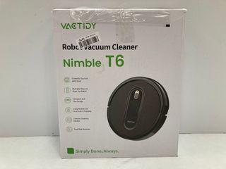 Robot aspirador Vactidy Nimble T6 en color negro. Incluye su base de carga y accesorios. - Robot aspirador Vactidy Nimble T6. - Base de carga. - Mando a distancia. - Manual de usuario. - Cepillos laterales de repuesto. Vactidy C6 Aspiradora con Cable,7M Cable Aspirador Escoba,600W Aspiradora Vertical,Sin Bolsa, Diseño Anti-Quemaduras Aspiradora De Pelo De Mascotas para Suelos Duros Alfombra