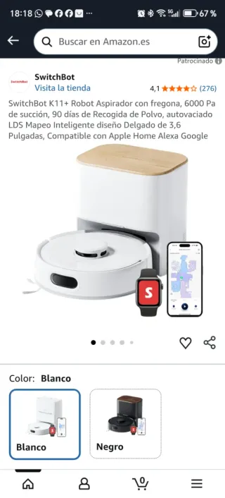 Robot aspirador SwitchBot K11+ en color blanco. Cuenta con fregona y una alta potencia de succión. - Autovaciado de polvo. - Mapeo inteligente LDS. - Diseño delgado. - Compatible con Apple Home, Alexa y Google.