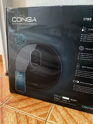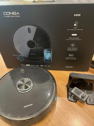 Robot aspirador y friegasuelos Conga 4090. Incluye base de carga y adaptador. - Aspira, friega, barre y pasa la mopa. - Navegación iTech Laser Eye. - Cepillo Jalisco. - Batería 5200 mAh. (Necesario cambiar 20€ aprox) - Precio negociable