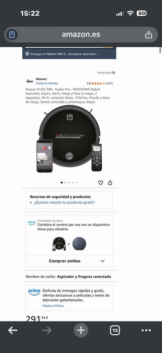 Vendo robot aspirador Neato D4 Connected, comprado en enero de 2020. Aspira correctamente y funciona perfectamente. No tiene funciones smart ni aplicación: funciona mediante un único botón de encendido. Detecta objetos y obstáculos mediante sensor LiDAR y sensor táctil frontal. Incluye: - Base de carga - Cepillo de recambio - Peine de limpieza + cepillo y filtro Ideal para quien busca un robot aspirador sencillo y eficaz. Product measurements Width: 34 cm Depth: 32 cm Height: 10 cm