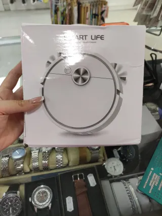 Robot aspirador inteligente de la marca Smart Life. Diseñado para facilitar la limpieza del hogar. - Diseño circular. - Botón de encendido/apagado. - Cepillos laterales.