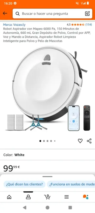 Robot aspirador de la marca Vozascly en color blanco. Cuenta con mapeo inteligente y gran autonomía. Está nuevo se lo hemos regalado a mi madre por los años , pero no lo quiere y se nos pasó ayer la devolución de Amazon. - Mapeo 6000 Pa - 150 minutos de autonomía - Depósito de polvo de 660 mL - Control por APP, voz y mando a distancia - Limpieza inteligente para polvo y pelo de mascotas