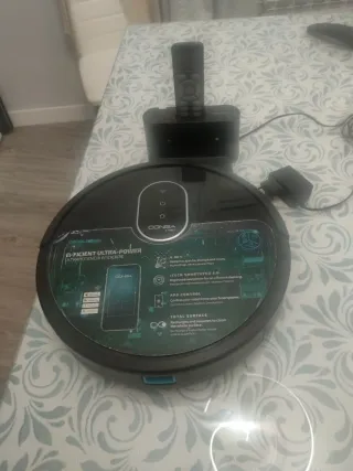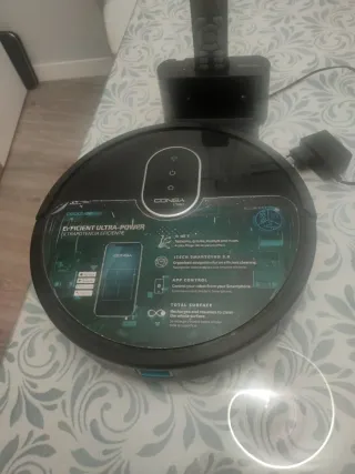 Robot aspirador con app móvil para controlar las estancias que ha limpiado. Funciona bien. La batería dura 30 minutos. Entrego con la base de carga, dos depósitos de fregado (uno creo que perdía algo de agua) y también el mando.