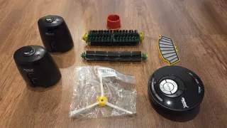 Kit de repuestos para robot aspirador Roomba i7. Incluye todo lo necesario para el mantenimiento. - 1 barrera virtual. - 6 filtros HEPA. - 8 cepillos laterales. - 1 cepillo principal (usado) - 2 recambios para las ruedas. - 1 rueda pequeña (usada) - 3 herramientas de limpieza.