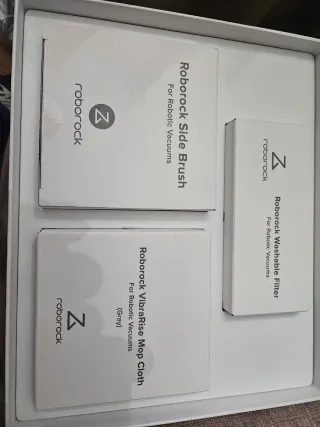 Set de recambios originales para robot aspirador Roborock, completamente nuevos y precintados. - Cepillo lateral Roborock. - Filtro lavable Roborock. - Paño de mopa VibraRise Roborock (Gris). C33