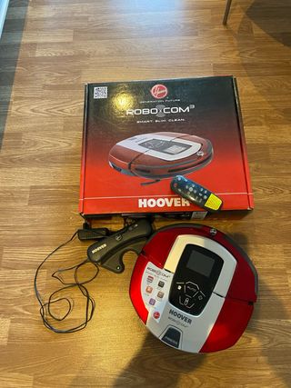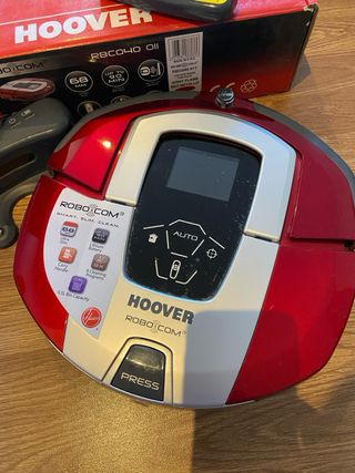Robot aspirador Hoover Robo.com³ en color rojo y plateado. Incluye mando a distancia y base de carga. Hace mucho que no se ha usado y habría que sustituirle la batería que cuesta unos 30 euros aproximadamente. Está como nuevo e incluye caja con accesorios y repuestos. - Diseño compacto y moderno. - Mando a distancia para control manual. - Base de carga para recarga automática.