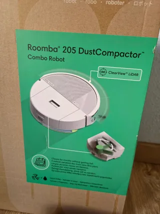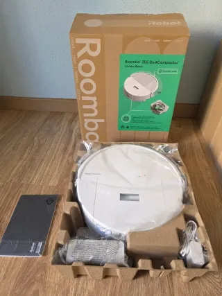 Robot aspirador Roomba 205 DustCompactor en su caja original, aspira y friega el suelo de ti casa con total comodidad. Solo usado una vez para apurar una habitación, se vende por tener otro modelo superior. - Incluye el robot aspirador. - Base de carga y cable de alimentación. - Manual de instrucciones. - Embalaje original.