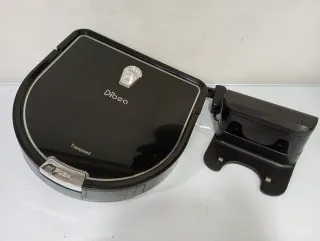 Robot aspirador Dibea de color negro con base de carga. - Diseño cuadrado con bordes redondeados. - Botón START en la parte superior. - Indicador PUSH.