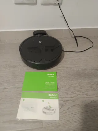 Robot aspirador Roomba en color negro. Incluye manuales. - Robot aspirador Roomba. - Manual de usuario. - Guía rápida. Dos filtros y dos aspas sin usar