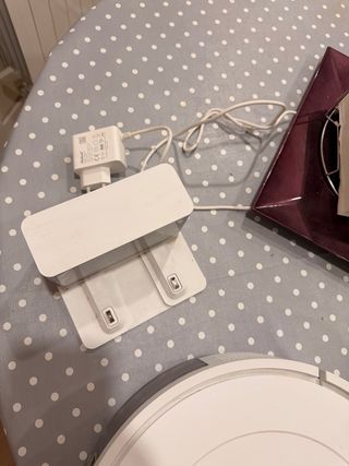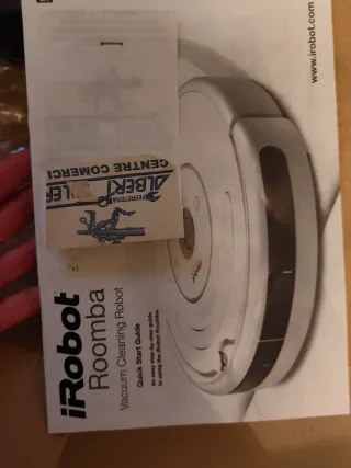 Robot aspirador y friega Roomba, ideal para mantener tus suelos limpios. - Diseño circular. - Base de carga incluida. - Cable de alimentación.