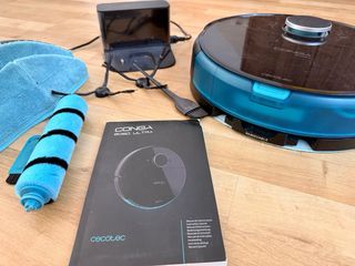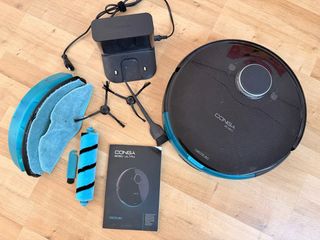 Robot aspirador Conga 8090 Ultra en color negro y azul. Incluye accesorios. - Robot aspirador Conga 8090 Ultra. - Base de carga. - Cepillos laterales. - Cepillo central. - Módulo de fregado con paños. - Manual de instrucciones.