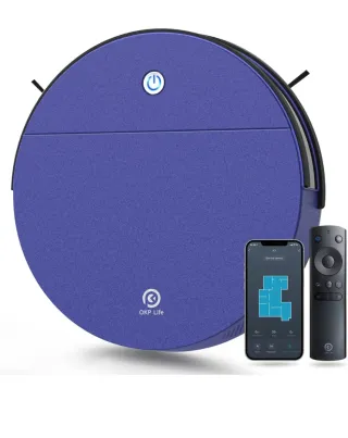Robot aspirador de suelo en color azul, con diseño circular y moderno. Incluye mando a distancia y pantalla de móvil con app. - Botón de encendido con luz. - Logo de OKP Life en la parte frontal.