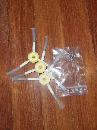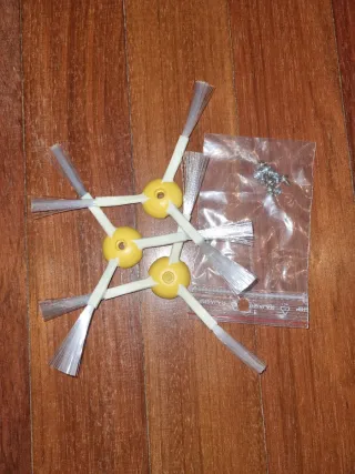 Set de cepillos laterales para robot aspirador Roomba serie 500. Incluye los tornillos necesarios para su instalación. - Color amarillo y blanco. - Material de plástico y cerdas. - Repuestos para Roomba.