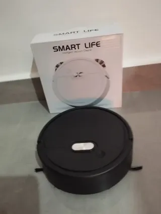 Aspirador robot inteligente de la marca Smart Life. Su diseño compacto y redondo lo hace ideal para la limpieza del hogar. - Color negro. - Botón de encendido/pausa. - Cepillos laterales.