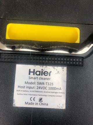 Robot aspirador Haier modelo SWR-T325. - Voltaje de entrada: 24VDC 1000mA. - Batería integrada: 14.4V/2000mAh. - Fabricado en China.