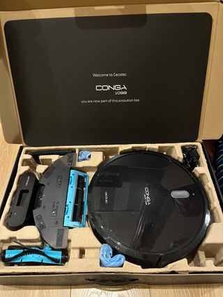 Aspiradora robot Conga 4690 Ultra. Aspira, Friega, Barre y Pasa la mopa. Se maneja desde la app o el mando que incorpora, la batería dura 300 min (en aspirado eco), accesorio para alfombras y otro para pelos de animales (nunca usado), la función limpieza sirve para todo tipo de suelos, mapea la casa y permite establecer programas, etc. Está casi como nuevo, se usó muy muy poco porque con niños en casa es más complicado (requiere que el suelo esté libre de juguetes, se asustan, etc)