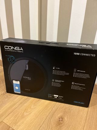 Robot aspirador Cecotec Conga 1099. - Bateria nueva. - Robot aspirador redondo. - Incluye base de carga. - Cepillo central. - Cepillo lateral. - Aspira y friega. - Conexion wifi con App. - Alexa y Google assistant. - Precio nueva 160 euros.