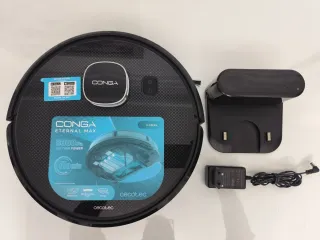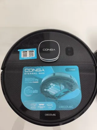 Aspiradora robot Conga Eternal Max con alta potencia de succión. - Modelo: Eternal Max - Potencia de succión: 3000 Pa - Autonomía: Hasta 110 minutos - Incluye base de carga y adaptador de corriente. - Conexion wifi, se puede activar desde el movil.