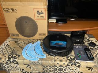 Robot aspirador Conga 7490 Ultimate en color negro. Diseñado para una limpieza eficiente del hogar. Le falta un tornillo en la tapa del filtro de basura , mopa no funciona muy bien por desgaste - Potencia de succión de 2600 Pa. - Autonomía de hasta 120 minutos. - Incluye base de carga y accesorios.