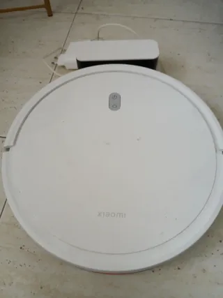 Robot aspirador de la marca Xiaomi en color blanco. Diseñado para facilitar la limpieza del hogar. - Diseño circular. - Botones de control en la parte superior. - Incluye base de carga.