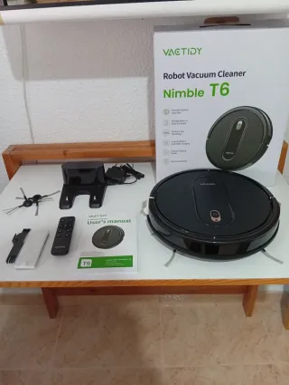 Robot aspirador Vactidy Nimble T6 en color negro. Incluye su base de carga y accesorios. - Base de carga. - Mando a distancia. - Cepillos laterales. - Filtro de repuesto. - Manual de usuario.