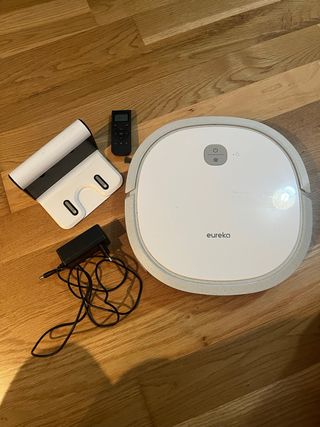 Robot aspirador Eureka N200 en color blanco y gris. Incluye mando a distancia y cargador. - Robot aspirador. - Mando a distancia. - Cargador.