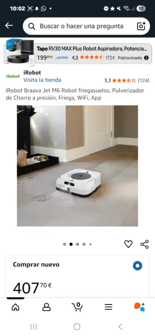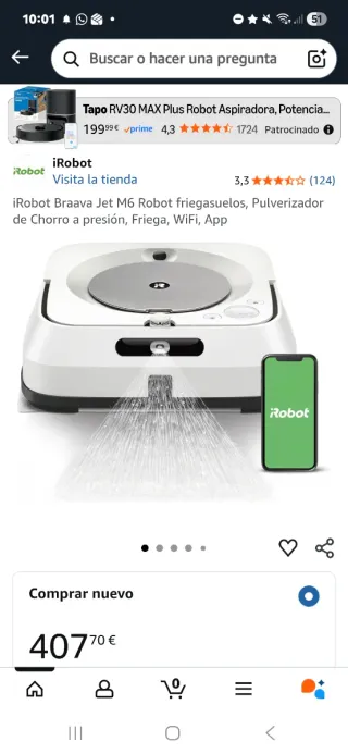 Precio Amazon 406€ Descuento +50% iRobot Braava Jet M6 Robot friegasuelos, Pulverizador de Chorro a presión, Friega, WiFi, App Robot friegasuelos iRobot Braava Jet M6 en color blanco. Diseñado para una limpieza eficiente de suelos duros. - Tecnología de navegación inteligente. - Pulverización precisa de agua. - Compatible con la app iRobot Home.