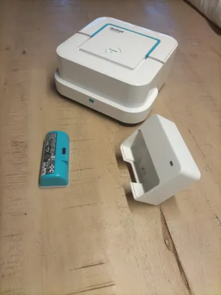 Robot fregasuelos Braava en color blanco. Funciona perfecto pero le falta la bandeja de la estación de carga. Carga igual pero le hay que poner una lámina de plástico debajo que le hice para que no deje la marca de la mopa cuando está en descanso - Diseño cuadrado con base de carga. - Indicador luminoso en la base. - Logo de la marca en la parte superior.