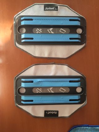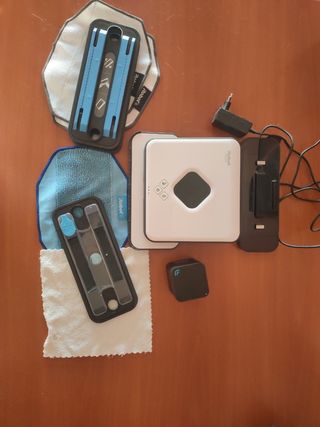 Robot friegasuelos. Incluye el robot Braava con función de limpieza en seco y en húmedo, base de carga, 2 accesorios para enganchar las balletas de limpieza en seco y 2 mopas. También incluye un accesorio y 1 balleta para para limpieza en húmedo. También se incluye el cubo GPS que localiza el robot y mejora la limpieza en toda la habitación. Se incluyen las instrucciones. Únicamente se ha usado 2 veces.