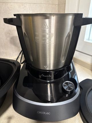 Robot de cocina Cecotec Mambo. - Jarra de acero inoxidable. - Incluye espátula y cestillo. - Tapa con cierre de seguridad. - Todos los accesorios - Se ha usado dos veces pero creo que falla el sensor de peso