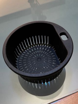 Cestillo accesorio para robot de cocina Mambo de Cecotec. Fabricado en plástico negro. - Diseño con perforaciones para el drenaje. - Asa integrada para facilitar su manejo.