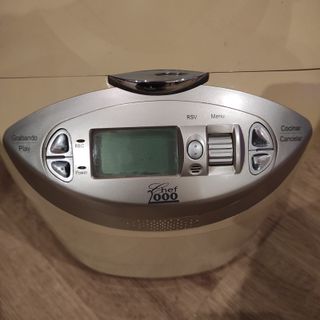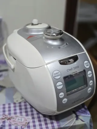 Olla programable Chef 2000 en buen estado. Tiene algunas señales de uso y aunque cierra bien , la pestaña esta rota. no afecta a la coccion. incluye libro de recetas - Modelo Chef 2000 con función Turbo. - Panel de control digital con varias opciones de cocción. - Permite programar el tiempo de cocción.