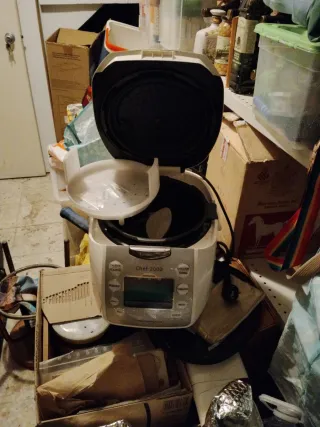 Se vende robot de cocina Chef O Matic Pro 2000, en buen estado. Tiene algunas señales de uso, pero funciona correctamente. - Modelo: Chef O Matic Pro 2000 - Incluye vaporera - Pantalla digital - Función mantener caliente - programable para que inicie y finalice a una hora concreta - funciones de horno, freír, vapor, pasta y arroz.