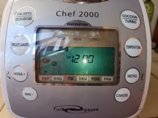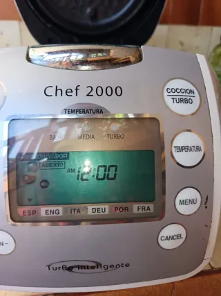 Robot de cocina Chef 2000, ideal para preparar tus comidas. Le falta la pieza del cierre que se ve en ma foto pero cierra perfectamente. - Panel de control con pantalla digital. - Botones de función: Caliente/Recalentar, Programar, Hora, Cocción Turbo, Temperatura, Menú y Cancelar. - Indicadores de temperatura: Baja, Media y Turbo. - Idiomas disponibles en pantalla: ESP, ENG, ITA, DEU, POR, FRA. - Indicaciones de cierre y apertura.