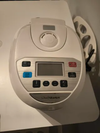 Robot de cocina Chef Titanium en color blanco. Diseñado para facilitar la preparación de tus comidas. - Panel de control digital. - Botones de función: Cancelar, Menú, Temp, Hora, Min, RSV. - Indicador de cocción. - Tapa superior con ventilación. Precio negociable