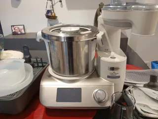 Tiene un poco de polvo de estar arriba del mueble : Kenwood Chef Plus CookEasy Platinum COMO NUEVO – todos los accesorios Vendo robot de cocina Kenwood Chef Plus CookEasy Platinum. Está prácticamente NUEVO y sin uso. Aún tiene el protector de la pantalla puesto. Incluye TODOS los accesorios originales, manuales y bolsas como se ve en las fotos. Funciones: • Cocina hasta 180 °C • Tritura, mezcla, pica y amasa • Robot multifunción muy potente • Pantalla táctil con recetas Costó alrededor de 800 900€ en amazon 1500 €nuevo. Estado: como nuevo, todo completo (solo sin caja). Precio:450 € negociables.