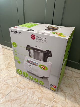 - Robot de cocina Monsieur Cuisine - - - Silver Crest. - Nunca se ha usado. Sin estrenar - Tiene soporte con ruedas ,para fácil manejo - Capacidad de tres litros - Función wifi - Potencia de 1000w - Cuece, cocina al vapor ,bate y amasa emulsiona ,mezcla ,pica, sofríe, pesa y tritura. Posibilidad de descargar recetas por Wi-Fi gratuitas - Jarra de acero inoxidable. - Pantalla táctil. - Dial giratorio para control.