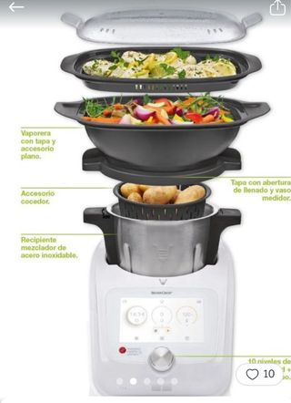 Robot de cocina tipo Thermomix programable Monsieur Cuisine Connect de SilverCrest. Incluye accesorios: cestillo de vapor, vaporera con tapa y bandeja para más capacidad. Mariposa y lengua sin utilizar Pantalla táctil y conexión wifi para descargar recetas ideal para cocinar fácilmente. Capacidad generosa. No se envia