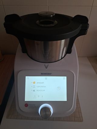 Robot de cocina Silvercrest Monsieur Cuisine Connect. - Incluye vaso, tapa, cuchilla, espátula, cestillo para arroz, aplique para amasar, y extra para cocinar al vapor. - Pantalla digital. - Peso digital - Botones de función y control de temperatura/tiempo. - Libro de instrucciones y recetario. - En perfectas condiciones (casi sin usar)