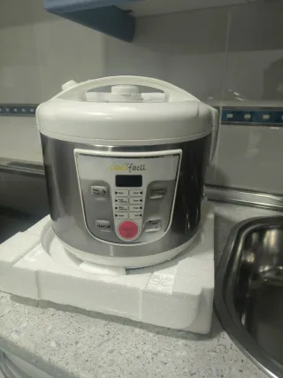 Robot de cocina multifunción Cocifacil en color gris y blanco. Cuenta con pantalla digital y varios programas de cocción. Esta totalmente nuevo sin usar solo se a sacado para hacerle las fotos para que se vea bien el producto Seria para 10 comensales 5 Litros tal y como se ve en el embalaje original de el producto - Programas: Arroz, Horno, Cocción Rápida, Guiso, Cocción Lenta, Salteado, Sopa, Frito, Grill. - Funciones: Tiempo de Reserva (RSV TIME), Tiempo de Cocción (COOKING TIME), Temperatura (TEMP). - Botón de encendido/apagado (ON/OFF).