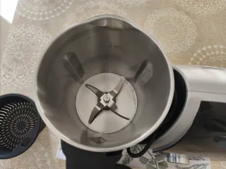 Robot de cocina Thermo, multifunción, en muy buen estado y con muy poco uso. Incluye: - Vaso de acero inoxidable. - Panel de control con pantalla digital. - Selector de temperatura con varias opciones (40°C, 60ºC, 80°C, 100°C, 120°C). - Varias velocidades y modo turbo. - Ideal para cremas, purés, salsas, masas, triturar, calentar y cocinar.