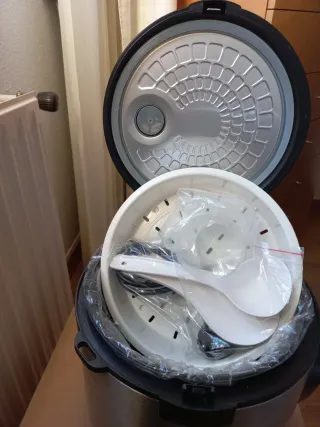 Robot de cocina multifunción CECOTEC. - Programas: Guiso, Sopa, Arroz, Pasta, Vapor, Caliente/Recalentar, Plancha/Freír, Horno, Lento. - Pantalla digital. - Diseño moderno en acero inoxidable y negro. - 5 litros de capacidad. - Incluye vaso medidor, cucharón, bandeja de horneado y cable de carga. - Totalmente nuevo en su caja original. - Como se puede apreciar en las fotos, nunca se ha llegado a utilizar.