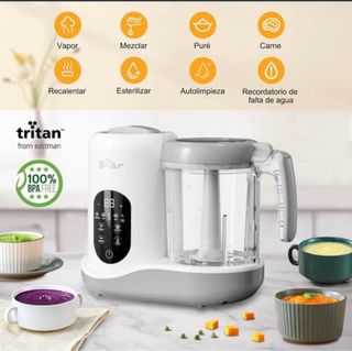Robot de cocina multifunción marca Bear, ideal para preparar alimentos para bebés y más. Fabricado con Tritan, libre de BPA. - Funciones: Vapor, Mezclar, Puré, Carne, Recalentar, Esterilizar, Autolimpieza. - Indicador de falta de agua.