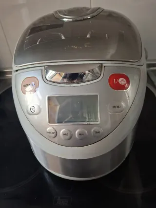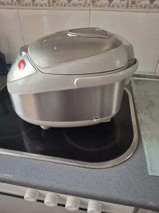 Robot de cocina multifunción Cook&Facil en color plateado y blanco. Cuenta con panel de control digital y varios programas. - Panel de control con pantalla digital. - Botones para funciones como Arroz, Guiso, Cocción lenta, Sopa, Plancha, Saltear, Hornear y Grill. - Botón Temp. / Temp. - Botón On/Off - Botón Cook/Time - Botón RSV Time No tengo embalaje, pero está sin estrenar.