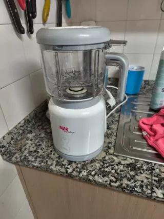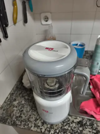 Robot de cocina Alfa Baby en color blanco y gris. Ideal para preparar alimentos. - Jarra transparente. - Asa lateral. - Base blanca con logo Alfa.